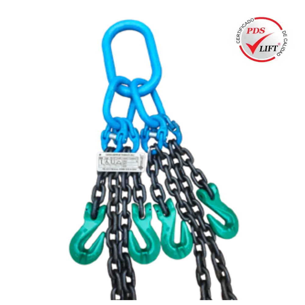 Eslingas de cadena para izaje de carga, confeccionadas con cadena de acero de aleación, con tratamiento térmico en grado (80) y Grado (100), nuestras cadenas están grabadas cada cierto numero de eslabones, fabricadas cumpliendo norma ASME B30.9
